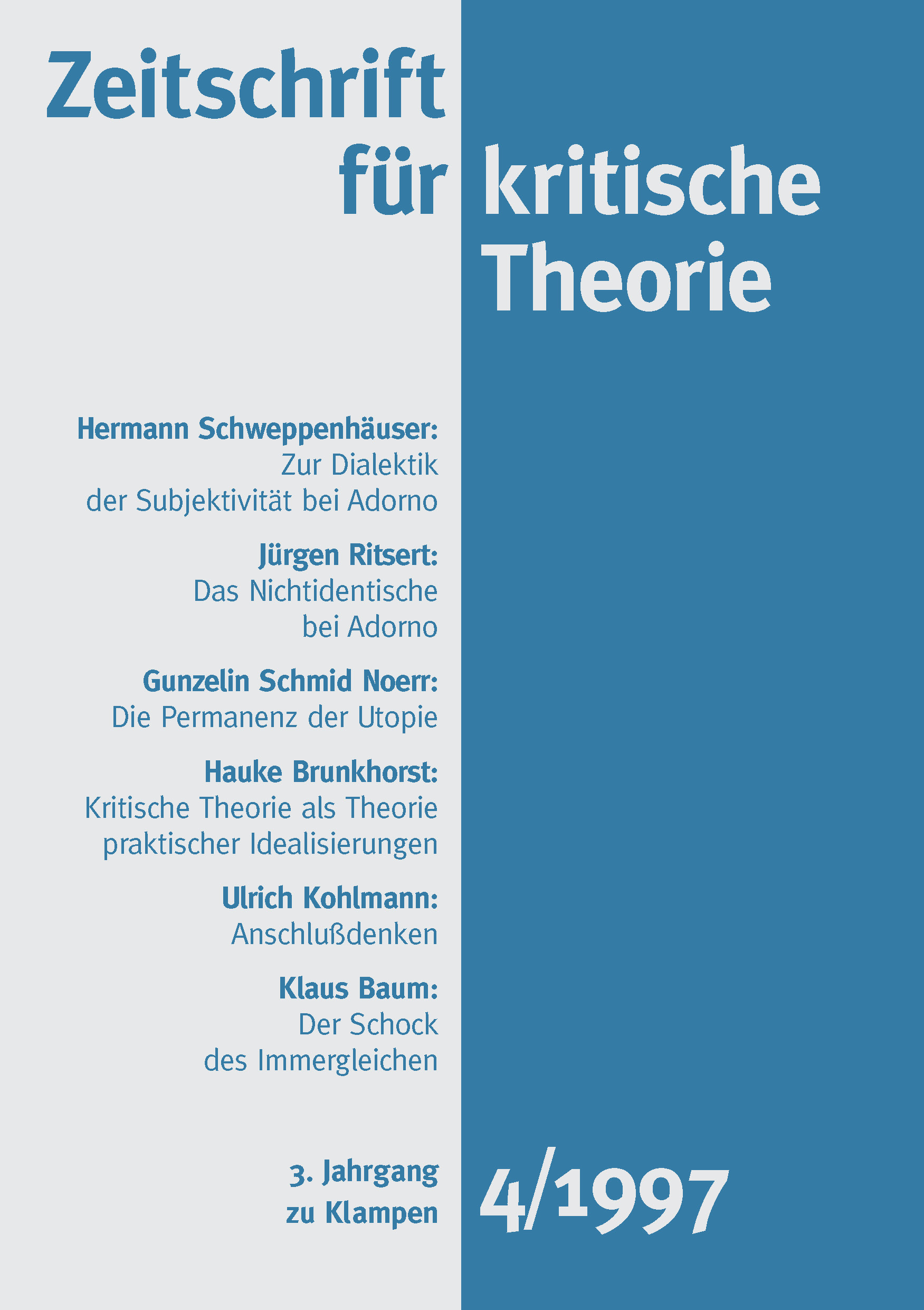 Aus dem Inhalt: Hermann Schweppenhäuser: Zur Dialektik der Subjektivität bei Adorno Jürgen Ritsert: Das Nichtidentische bei Adorno – Substanz- oder Problembegriff? Gunzelin Schmid Noerr: Die Permanenz der Utopie – Herbert Marcuse Hauke Brunkhorst: Kritische Theorie als Theorie praktischer Idealisierungen Ulrich Kohlmann: Anschlußdenken. Sybille Tönnies‘ Beitrag zur Psychologie des Konvertiten Klaus Baum: Der Schock des Immergleichen. Anmerkungen zur Gegenwartskunst