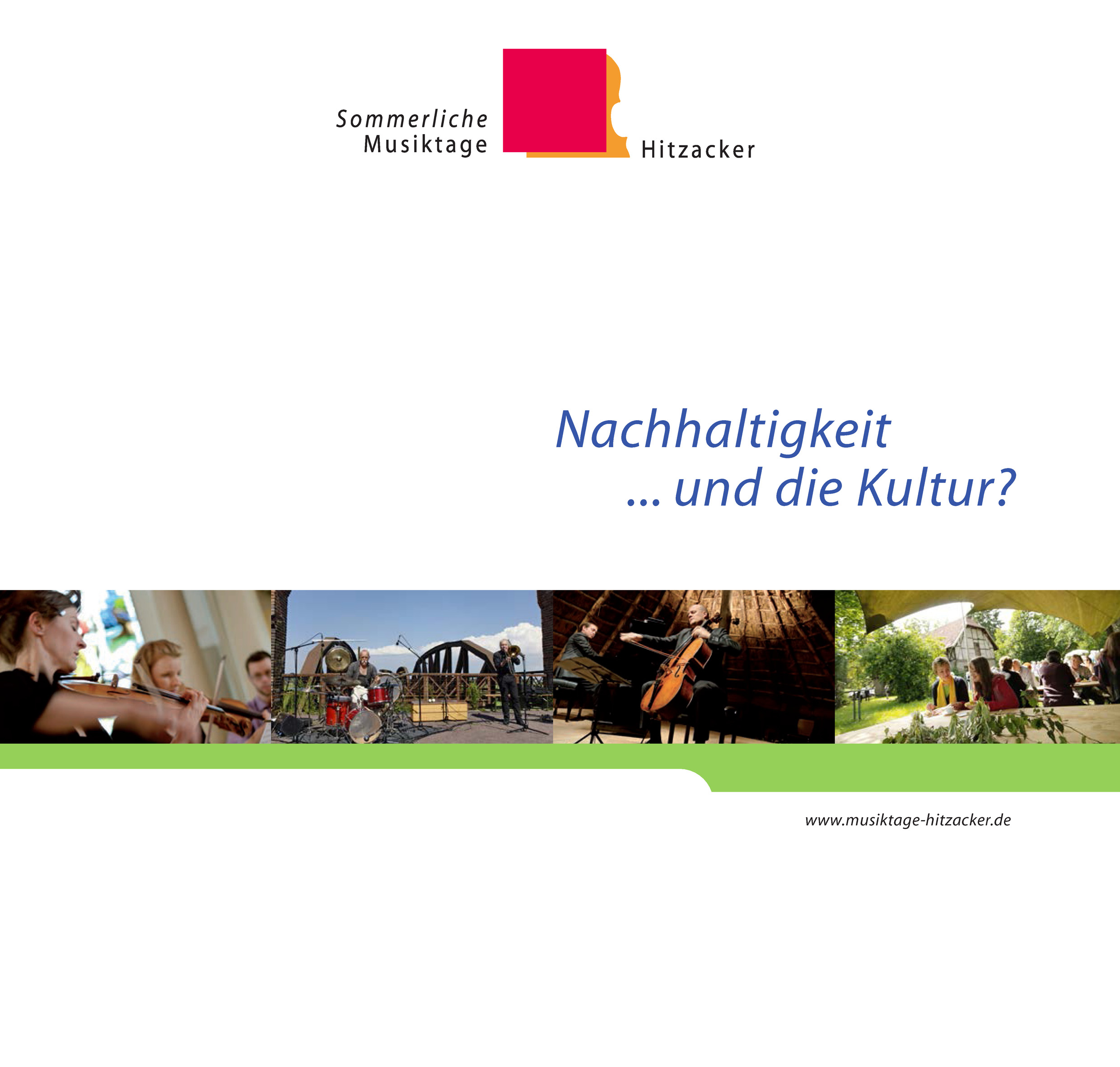 Auch Kulturveranstalter beginnen, über nachhaltige Produktion und Lebensgestaltung verantwortungsbewusst nachzudenken und sich der Herausforderung der Nachhaltigkeit mit entsprechenden Konzepten zu stellen. Der Trägerverein der Sommerlichen Musiktage Hitzacker hat 2011 beschlossen, dieses Thema auch in der deutschen Klassik-Landschaft zur Sprache bringen – und damit einen ersten konkreten Beitrag zur Diskussion über die Rolle der sogenannten „Hochkultur“ in der nachhaltigen Entwicklung zu leisten. Den Entwurf eines eigenen Konzepts hat der Verein Ende 2012 vorgelegt. Beim 68. Festival 2013 haben Experten und Publikum dieses Thema beim „Forum Nachhaltigkeit“ diskutiert. Referenten waren: Prof. Dr. Hansjörg Küster, Prof. Dr. Johannes Prüter, Stefan Voelkel, Sigrid Maier-Knapp-Herbst und Prof. Dr. Volker Kirchberg. Moderatorin: Linda Anne Engelhardt. „Nachhaltigkeit. und die Kultur?“ ist die Dokumentation des ersten „Forum Nachhaltigkeit“.
